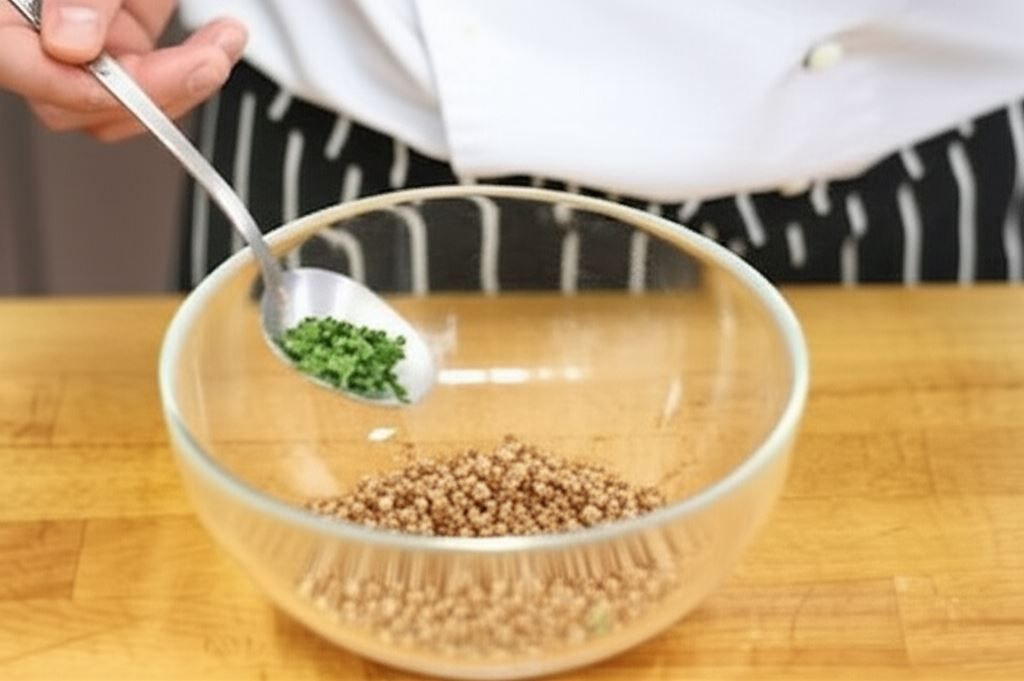 Kaszę przygotuj zgodnie z instrukcją podaną na opakowaniu. Do ostudzonej kaszy wsyp posiekane zioła.