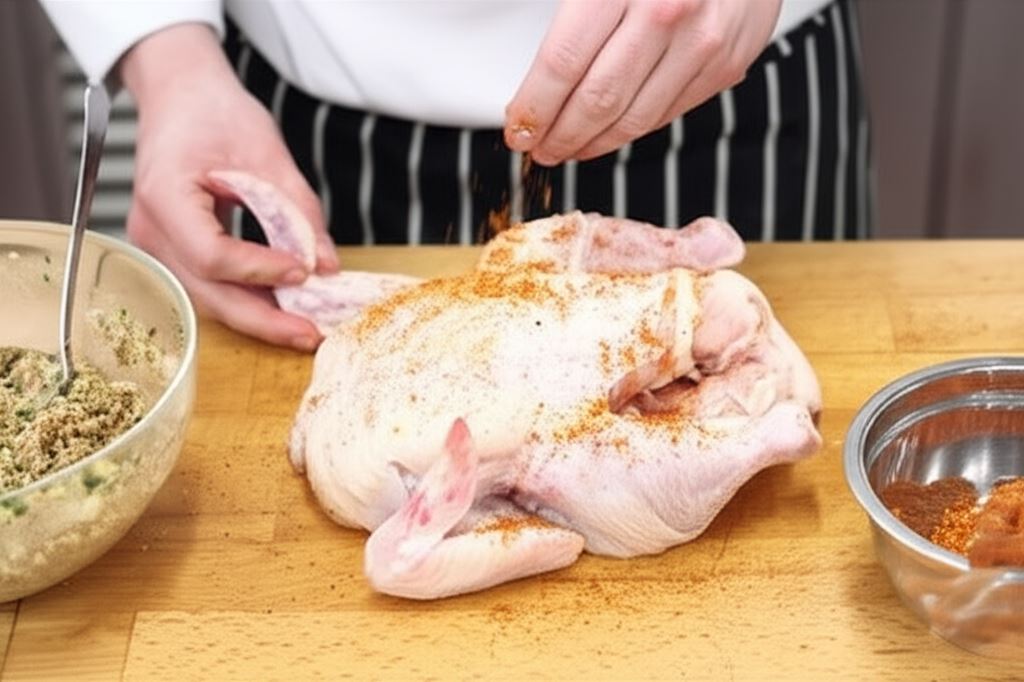 Oczyszczonego kurczaka wysusz i natrzyj od środka i zewnątrz przyprawą do kurczaka. Potem wypełnij jego wnętrze przygotowaną kaszą i zamknij otwór wykałaczkami lub zaszyj dratwą.