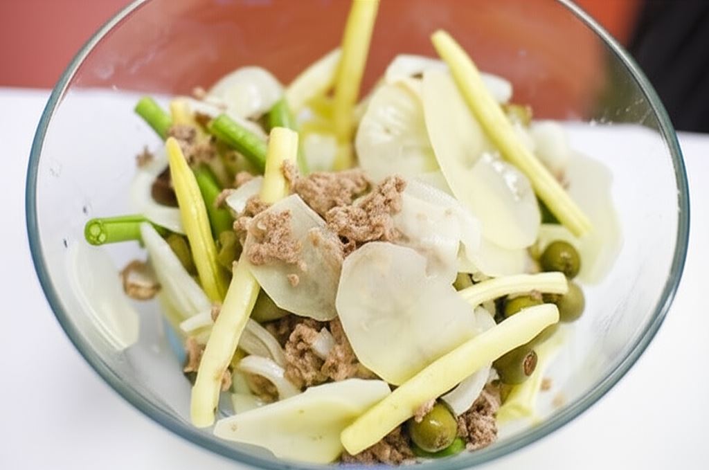 Posiekaj ziemniaki i cebulę na plastry, czosnek przepuść przez praskę. Wymieszaj składniki z tuńczykiem, oliwkami i fasolką.