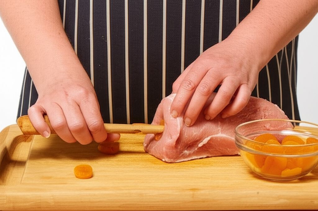 Przekłuj kawałek mięsa wzdłuż włókien trzonkiem drewnianej łyżki. Wypełnij je morelami, wpychając je drewnianą łyżką.