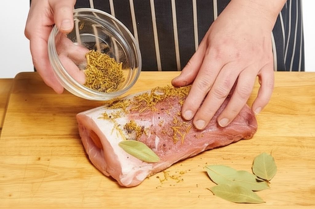 Zdejmij skórkę z cytryny. Połącz skórkę cytrynową z pieprzem, zielem angielskim i liśćmi laurowymi. Natrzyj mięso tą mieszanką. Odstaw na noc okryte folią aluminiową.