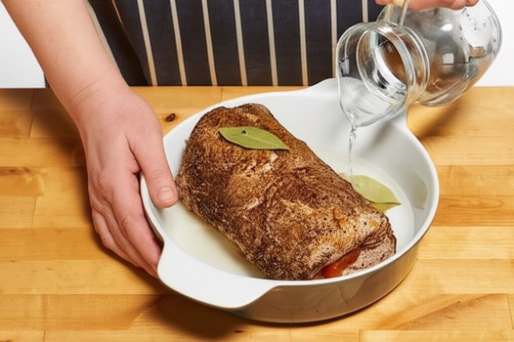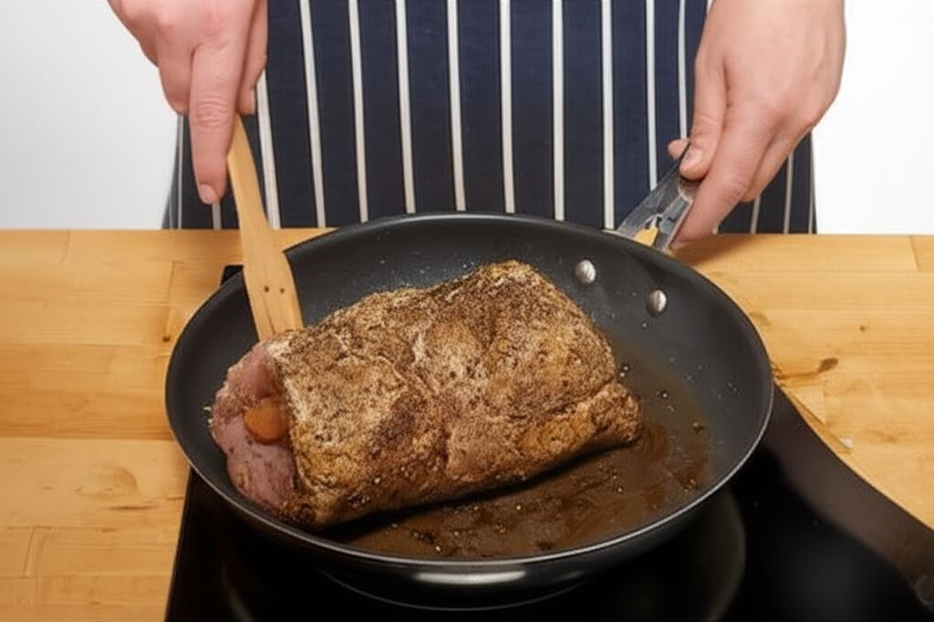 Nagrzej piekarnik do 190°C. Polej mięso 2 łyżkami stołowymi oleju z obu stron i przysmaż na patelni. Potem przenieś do brytfanny.