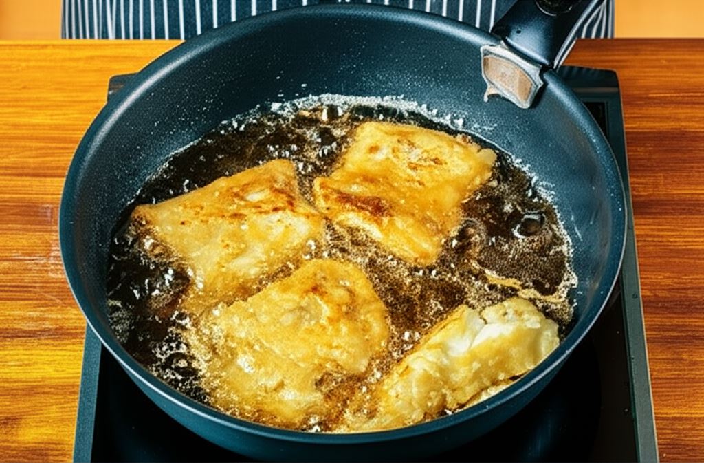 Zanurz kawałki ryby w cieście i smaż je na gorącym oleju.