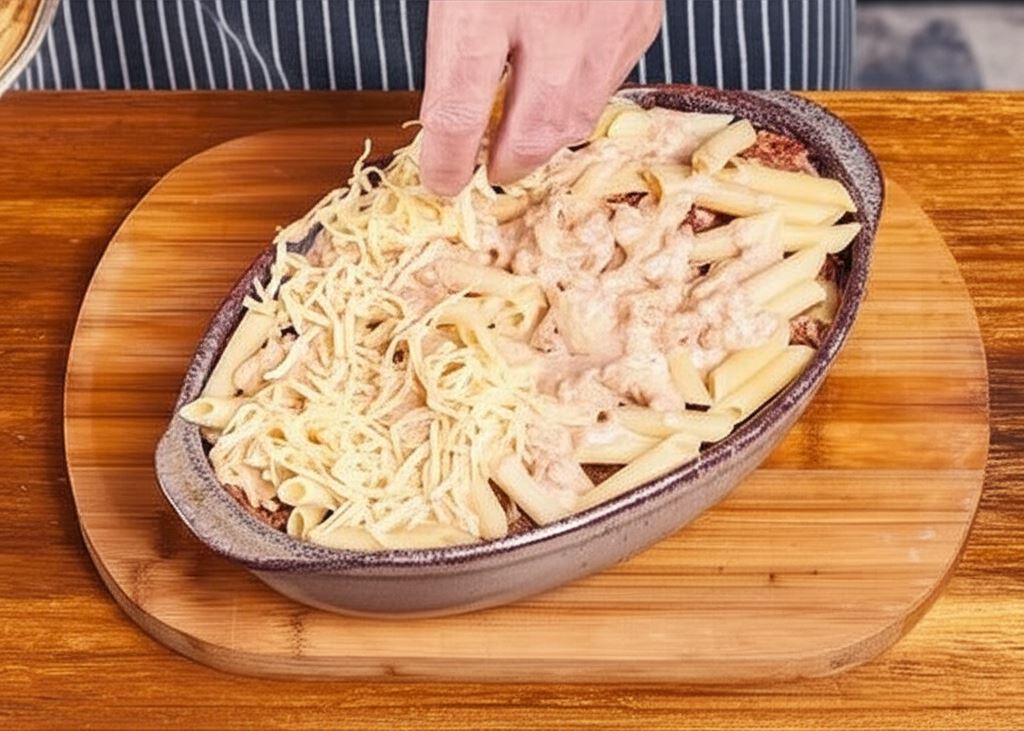 Wsyp resztę makaronu i zalej wszystko pozostałym sosem. Ser zetrzyj na tarce o dużych oczkach i rozsyp na górze. Zapiekaj w piekarniku rozgrzanym do 180 stopni przez około 70 minut.