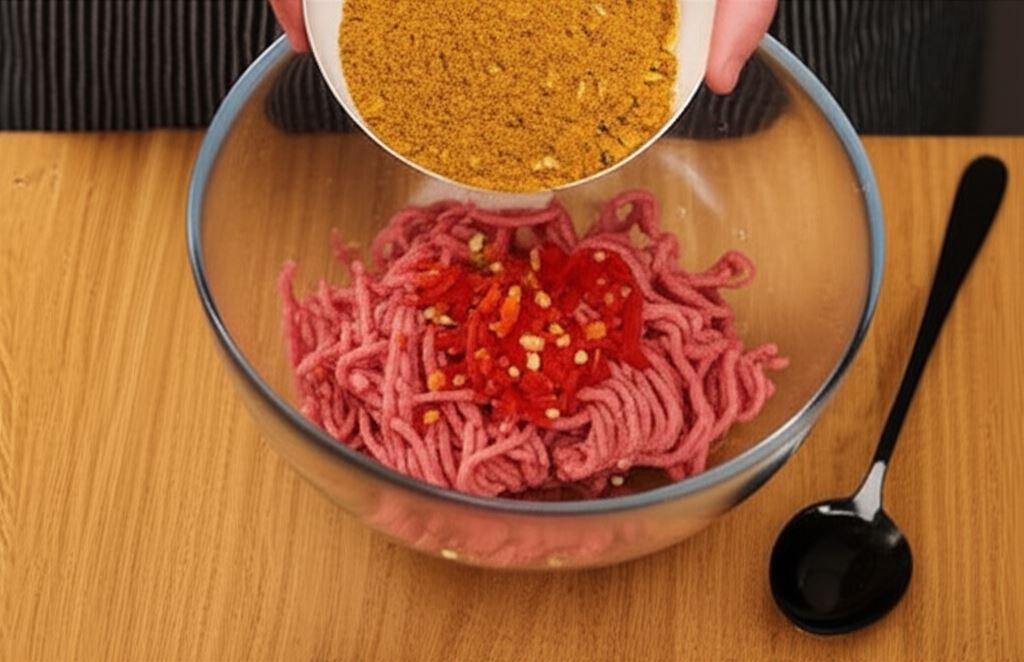Mięso umieść w misce, wsyp fix soczyste pulpety Knorr, wlej wodę i dodaj posiekaną papryczkę chili. Starannie wymieszaj.