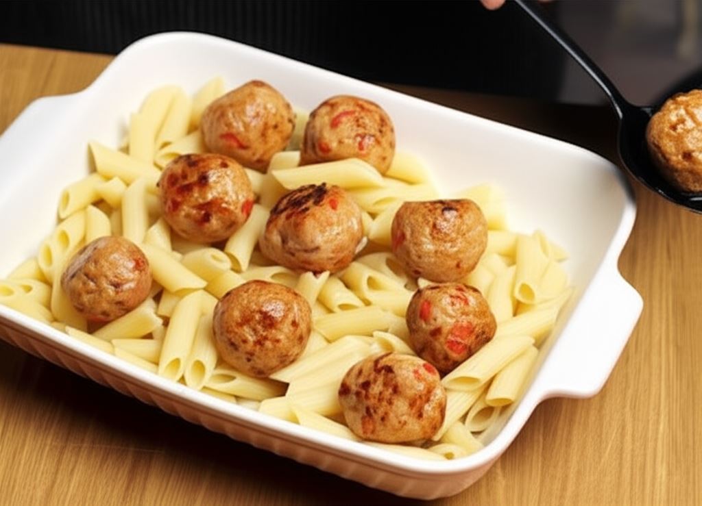 Przenieś do naczynia żaroodpornego ugotowany makaron i usmażone klopsiki.