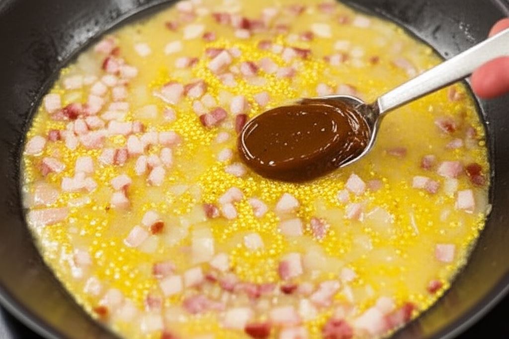 Na rozgrzanym tłuszczu zrumień pokrojony w kostkę boczek, kiedy wytopi się w połowie wsyp pokrojoną w kostkę cebulę. Całość podsmażaj moment, następnie dodaj kaszę jaglaną i połącz z wytopionym tłuszczem. Wszystko zalej wodą zachowując proporcję 1:2 w stosunku do kaszy. Aby farsz był perfekcyjnie przyprawiony dodaj Kostkę do mięs pieczeniową Knorr i starannie rozpuść ją w gotującej się wodzie.