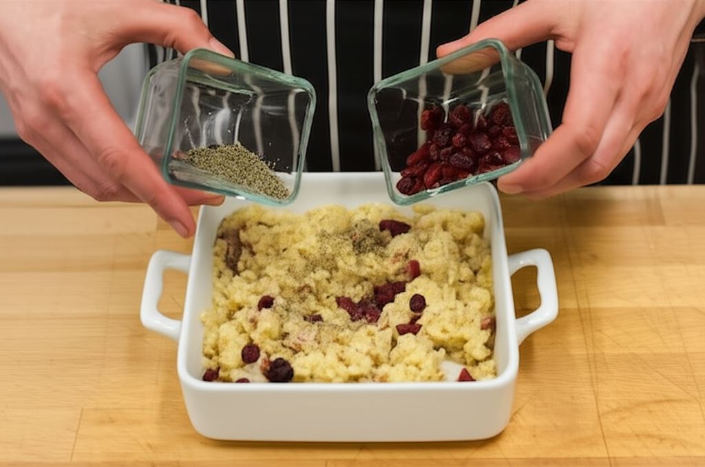 Kaszę wsyp do naczynia żaroodpornego, nakryj i umieść w piekarniku rozgrzanym do 150°C na około 30 minut. Po upływie tego czasu kasza powinna być miękka i sypka. Uprażoną kaszę dopraw majerankiem do smaku i wymieszaj z suszoną żurawiną. Odstaw, aby ostygła.