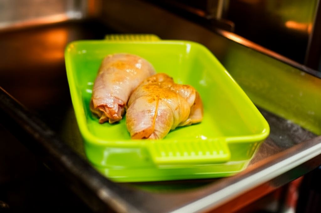 Udka obsmaż na patelni, następnie przenieś do naczynia żaroodpornego. Piecz w temperaturze 180°C przez około 90 minut.