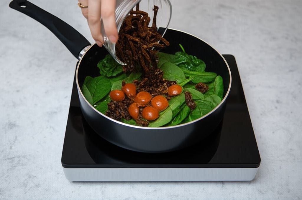 W międzyczasie na głębokiej patelni na rozgrzanym oleju zrumień cebule z czosnkiem i pestki dyni, smaż je moment, wsyp szpinak, pomidorki koktajlowe i pomidory suszone.