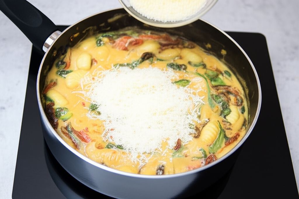 W misce wymieszaj fix Knorr ze 100ml śmietany i z 200ml wody. Przelej na patelnię, wsyp ugotowane gnocchi, całość gotuj przez 1-2 minuty, łącząc wszystkie składniki razem. Na końcu gotowania dodaj parmezan.
