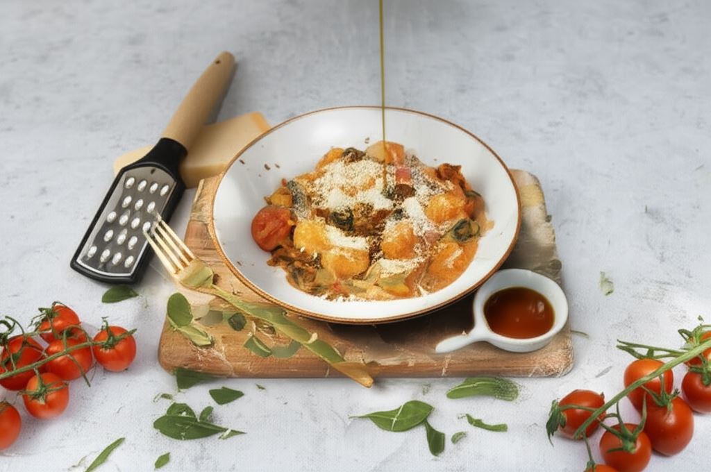 Podaj gnocchi na eleganckich, głębokich talerzach, hojnie posypane świeżo startym parmezanem – niezbędnym elementem włoskiej kuchni. Dla intensywniejszego aromatu dodaj prażone pestki dyni i skrop całość wysokiej jakości oliwą z pestek dyni. Możesz również udekorować danie świeżymi listkami bazylii lub rukoli dla dodatkowego koloru i świeżości.