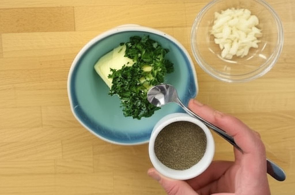 W miseczce wymieszaj masło, posiekaną natkę pietruszki, posiekany czosnek, wsyp sól i pieprz do smaku – wszystko ugniataj na jednolitą masę, umieść na papierze do pieczenia lub folii spożywczej, uformuj rulonik o średnicy około 2-3 cm i wstaw do lodówki.