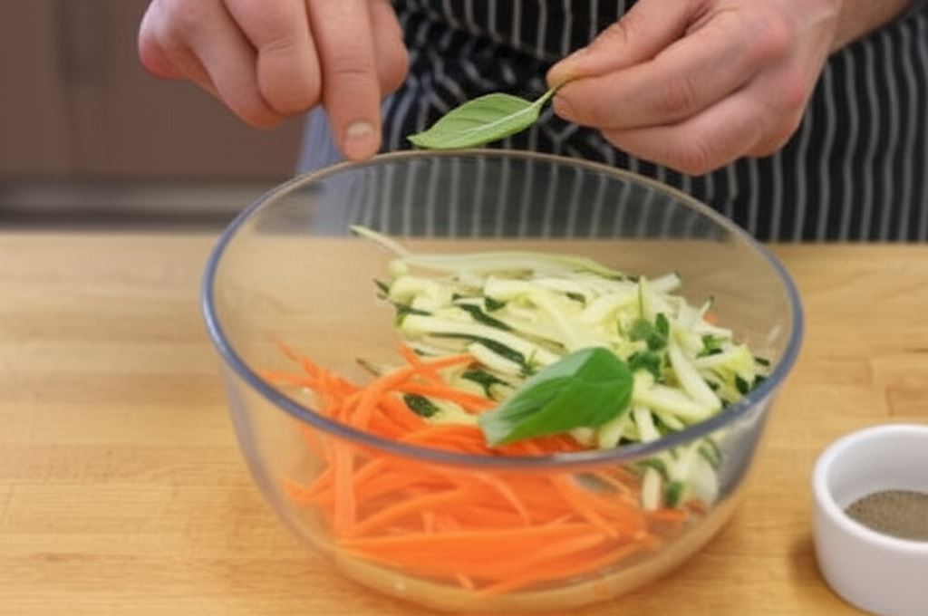 Cukinię i marchewkę pokrój w długie, cienkie paski – warzywne spaghetti. Przełóż do miski, wsyp pokrojoną bazylię, dodaj sól i pieprz, po czym wymieszaj.