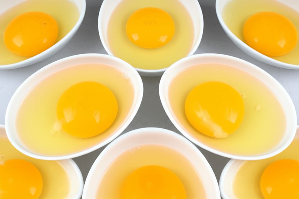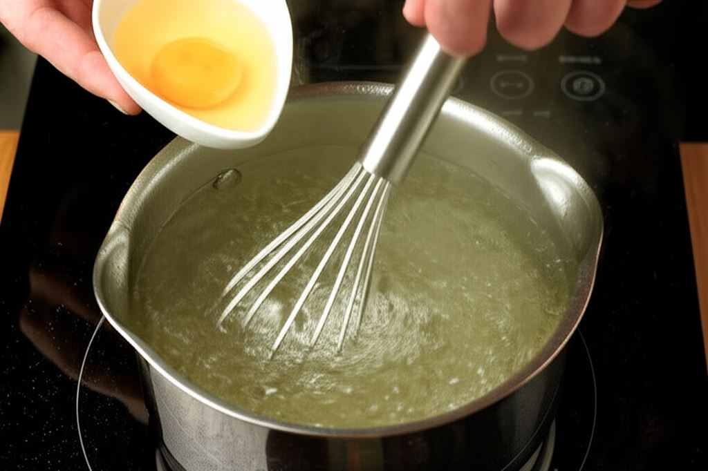 W niewielkim rondelku doprowadź wodę do wrzenia. Wsyp sól i wlej ocet. Zamieszaj pośrodku tworząc wir i wlej powoli roztrzepane jajka. Gotuj około 3 min. Odcedź.