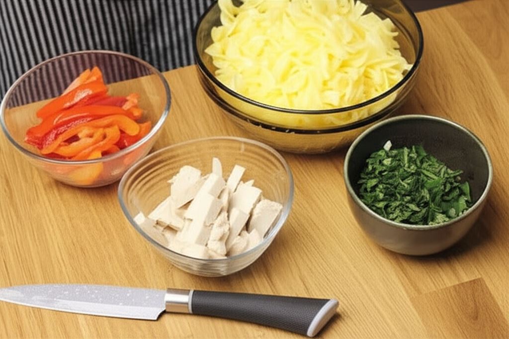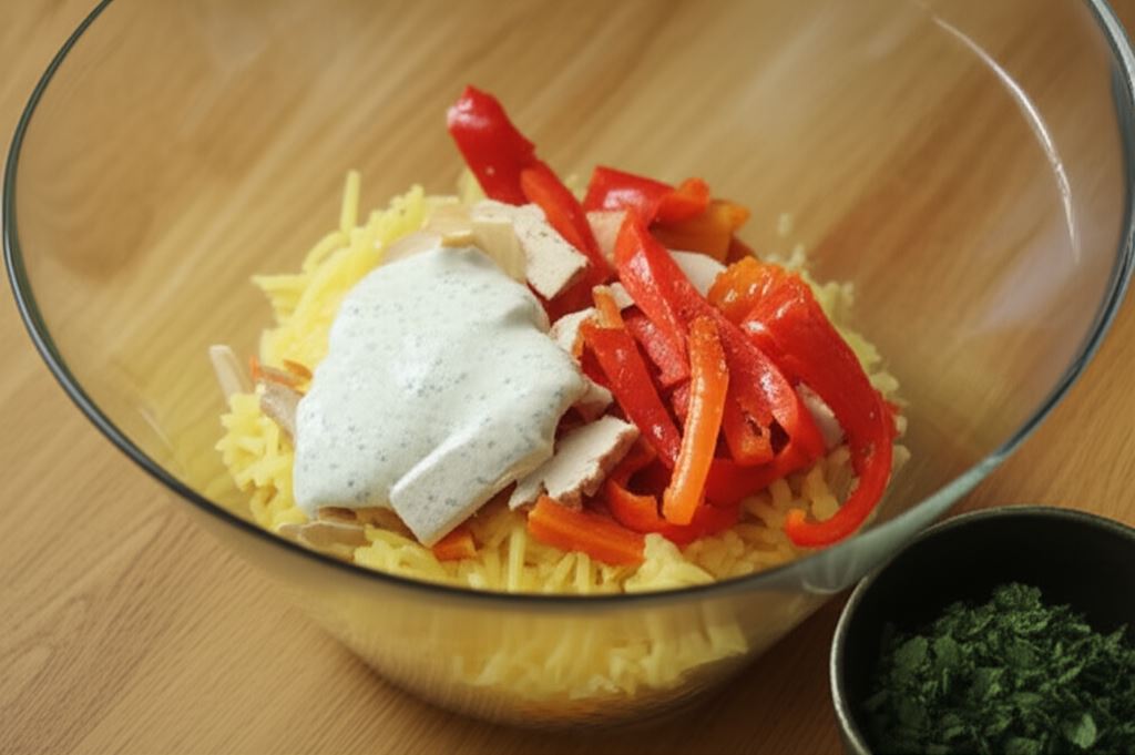 Nasza wegańska sałatka makaronowa to prawdziwa uczta dla podniebienia! Delikatny makaron połączony z kolorowymi warzywami i aromatycznym tofu tworzy kompozycję, która zachwyci nawet najbardziej wymagających smakoszy. Sekret tej potrawy tkwi w kremowym sosie na bazie majonezu wegańskiego, który nadaje całości aksamitnej konsystencji i wyrazistego smaku. Świeża natka pietruszki dodaje lekkości, a kiełki sojowe stanowią nie tylko efektowną dekorację, ale również źródło cennych składników odżywczych.