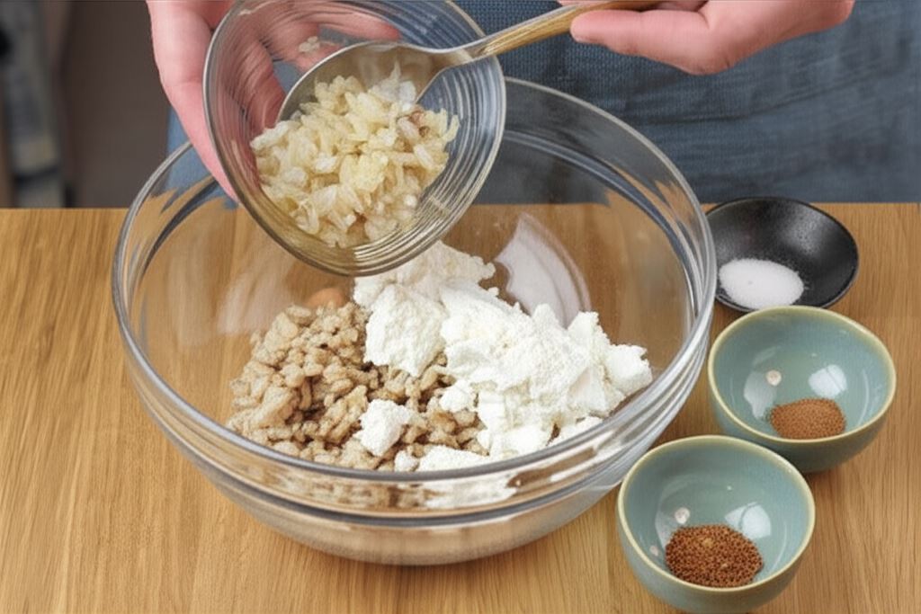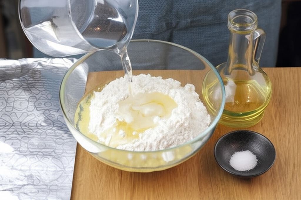 Sporządź ciasto. Do naczynia przesiej mąkę, dodaj olej i przypraw odrobiną soli. Zalej gorącą wodą, następnie okryj dokładnie folią aluminiową i odstaw na 30 min.