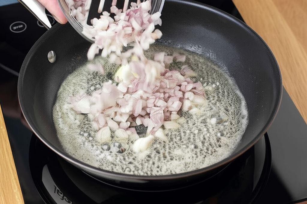 Szalotkę posiekaj w małą kostkę i zrumień z masłem na patelni. Odłóż do ostygnięcia.