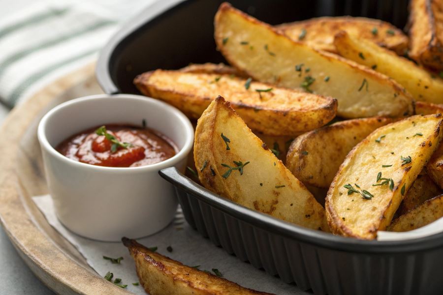 Ziemniaki z airfryer najlepiej smakują podane natychmiast po upieczeniu. Doskonale komponują się z dipami na bazie jogurtu z ziołami, sosem czosnkowym lub klasycznym ketchupem. Stanowią idealny dodatek do dań mięsnych, ryb lub jako samodzielna przekąska z dodatkiem świeżych ziół.