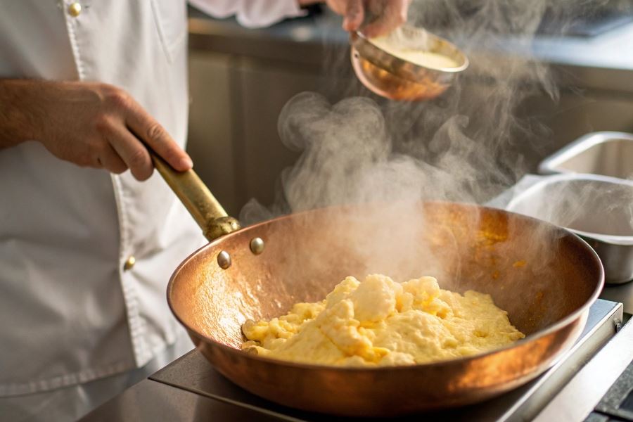 Technika ciągłego mieszania polega na nieustannym przemieszczaniu jajek po patelni szpatułką silikonową, co tworzy drobne, delikatne kawałki i jedwabistą teksturę.
