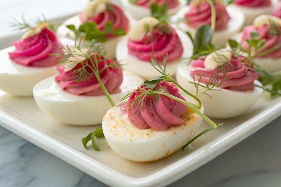 Dekoracja jajek faszerowanych rzodkiewką może być minimalistyczna lub bogata: