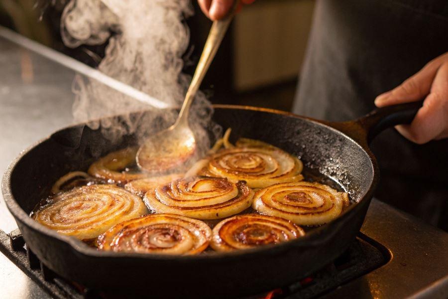 - Zbyt wysoka temperatura – cebula przypala się zamiast karmelizować