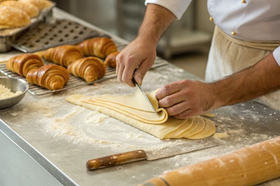 Podstawą idealnych croissantów jest prawidłowe składanie ciasta z masłem (tzw. tours):