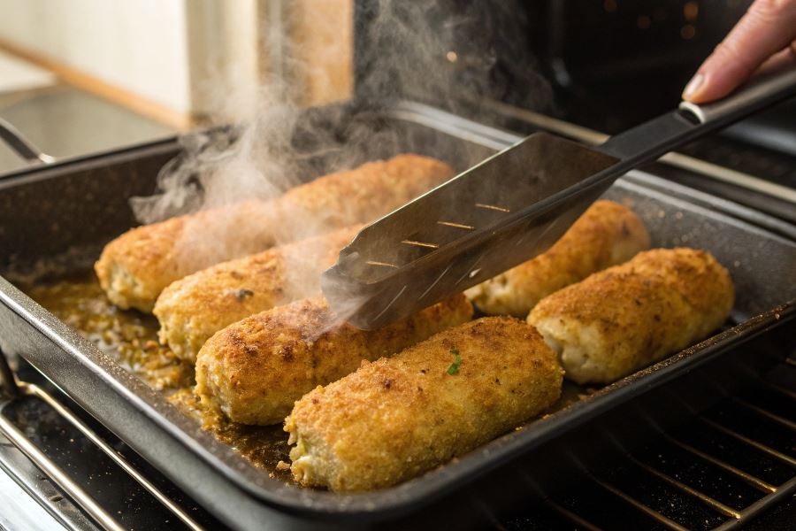 Przed umieszczeniem krokietów w piekarniku, wyjmij je z lodówki na około 15 minut. Zbyt zimne krokiety włożone do gorącego piekarnika mogą pęknąć lub odgrzać się nierównomiernie. Następnie delikatnie osusz je papierowym ręcznikiem, aby usunąć nadmiar wilgoci – to kluczowy krok dla uzyskania chrupiącej panierki.