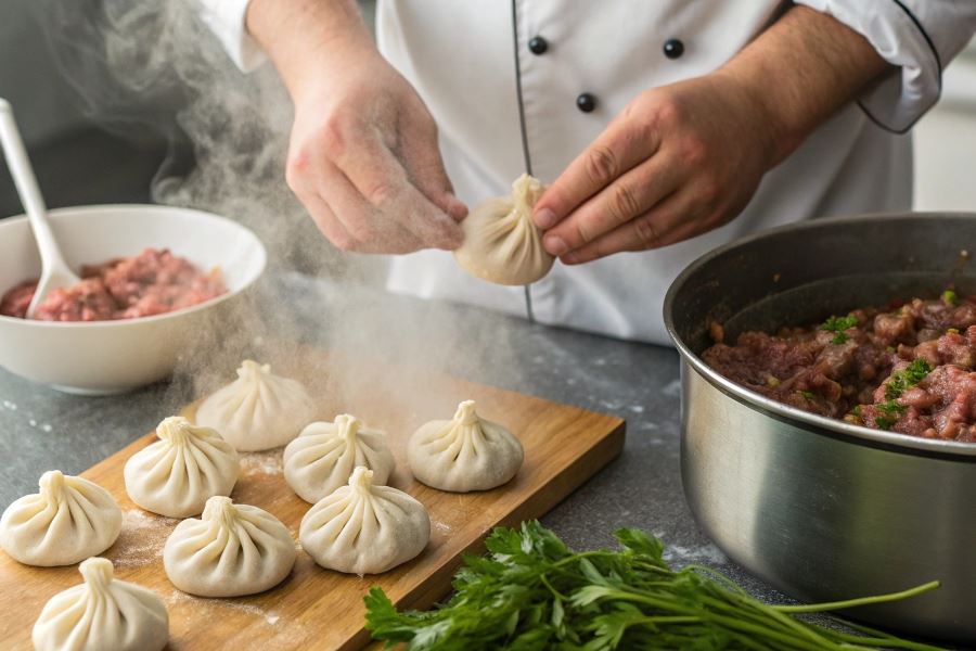 Formowanie chinkali to prawdziwa sztuka wymagająca precyzji. Ciasto na chinkali powinno być elastyczne, ale nie za cienkie – idealna grubość to około 2-3 mm. Na krążek ciasta o średnicy 10-12 cm nakłada się łyżkę farszu z bulionem w proporcji 2:1 względem ciasta. Następnie wykonuje się charakterystyczne zagniecenie: