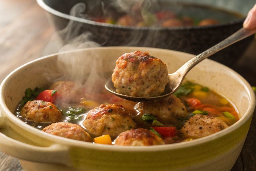 Gotowanie i serwowanie klopsików z kurczaka w zupie