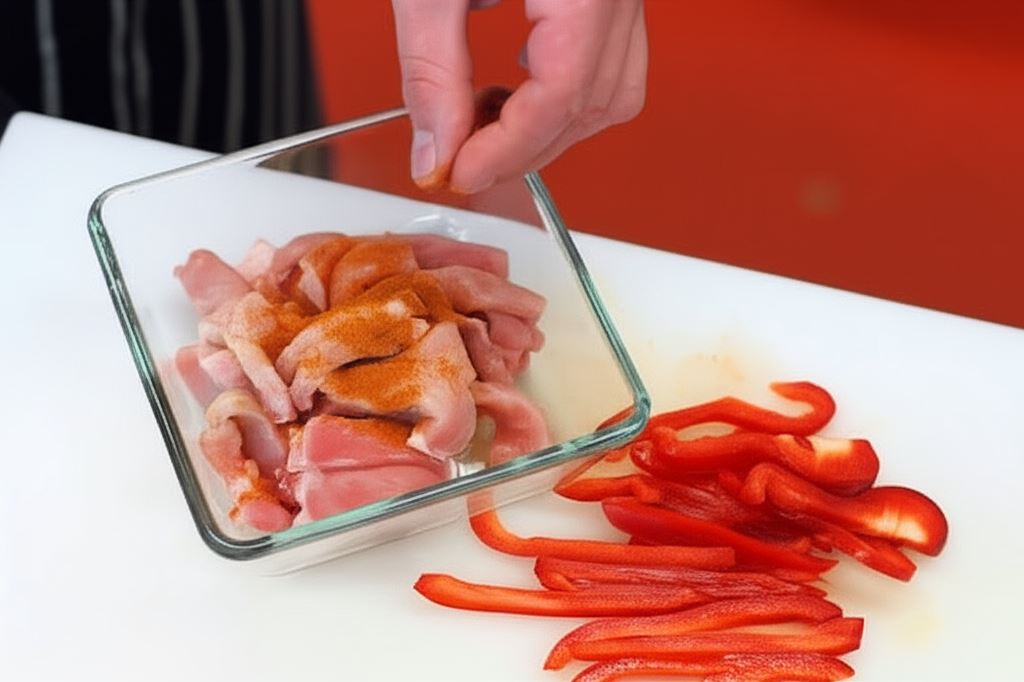 Mięso oraz paprykę potnij w paski. Potem posyp ostrą papryką i zrumień na patelni.