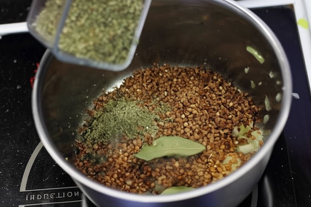 Wsyp kaszę gryczaną, liść laurowy i majeranek. Całość podsmażaj przez kilka minut.