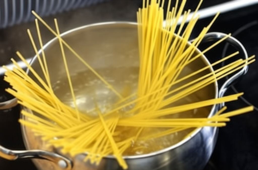 W dużym garnku doprowadź wodę z odrobiną soli do wrzenia. Kiedy zacznie wrzeć, dodaj odmierzoną porcję makaronu spaghetti i gotuj według wskazówek producenta zamieszczonych na opakowaniu.