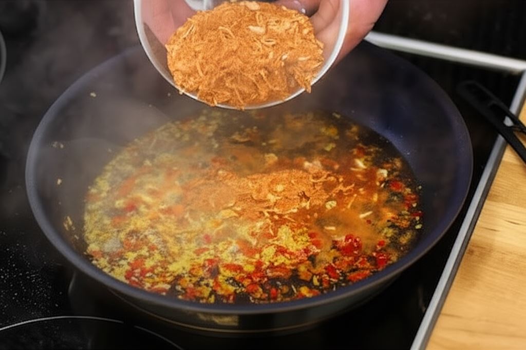 Rozgrzej na patelni małą ilość oliwy. Kiedy tłuszcz stanie się gorący, dodaj posiekany ząbek czosnku i papryczkę. Gdy warzywa zaczną się lekko rumienić, wsyp Knorr Chłopski garnek i wlej 350 ml wody. Wszystko dokładnie wymieszaj, aby proszek z opakowania dobrze się rozpuścił.