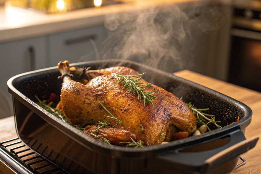- Cała kaczka (podzielona): 160°C przez 40 minut, następnie 180°C przez 15 minut dla uzyskania chrupiącej skórki