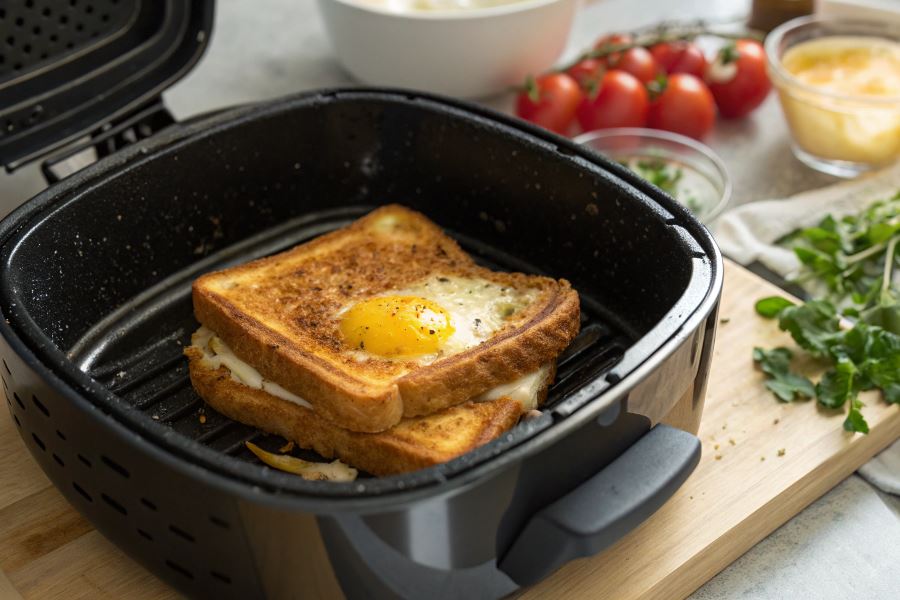 Śniadaniowe sandwicze typu croque-madame przygotowane w airfryer zachowują soczystość wewnątrz przy jednoczesnym uzyskaniu chrupiącej skórki. Wystarczy ułożyć warstwowo chleb tostowy, ser, szynkę i jajko, a następnie piec przez 7-8 minut w temperaturze 200°C.