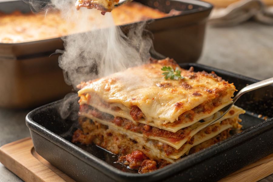 Po wyjęciu z airfryera pozostaw lasagne na 5-7 minut do odpoczynku – w tym czasie sos zgęstnieje, a warstwy się ustabilizują. Dzięki temu porcje będą łatwiejsze do wycięcia i podania.