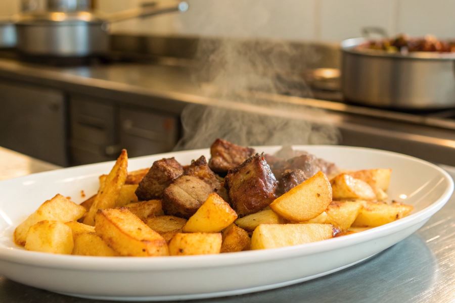 Optymalne proporcje to 60% ziemniaków do 40% mięsa, co zapewnia równowagę między sytością a lekkością dania. Ziemniaki należy pokroić w kostki o wymiarach około 2×2 cm, a mięso w nieco mniejsze kawałki (1,5×1,5 cm), co zapewni równomierną obróbkę termiczną.