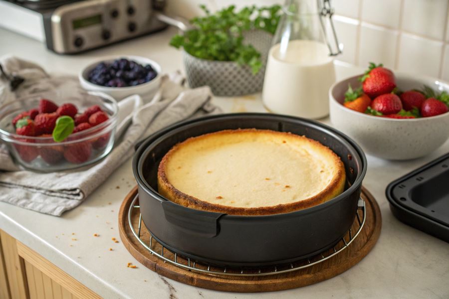 - Pozostaw sernik w wyłączonym, ale zamkniętym airfryer na 10 minut