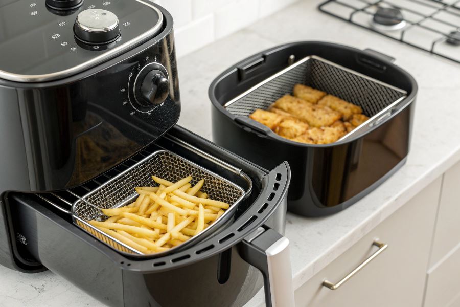 W praktyce oba terminy opisują urządzenie działające na tej samej zasadzie – cyrkulacji gorącego powietrza wokół żywności, co pozwala uzyskać efekt smażenia przy minimalnym użyciu tłuszczu.