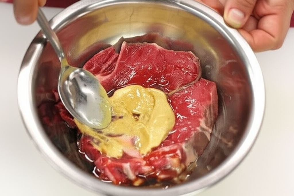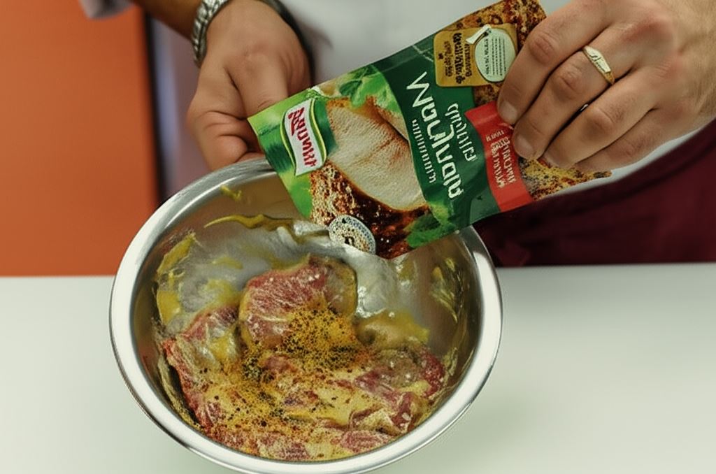 Potem dodaj przyprawę Knorr i pozostaw na 15 minut, aby mięso delikatnie się zamarynowało.