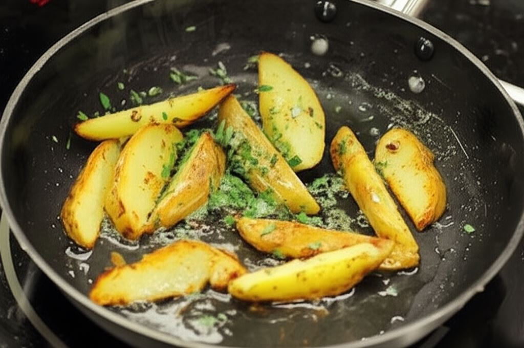 Ziemniaki smaż na oleju, dopóki staną się chrupiące. Przypraw je solą, pieprzem cayenne i posiekanym rozmarynem. Mięso serwuj razem z ziemniakami od razu po przyrządzeniu.