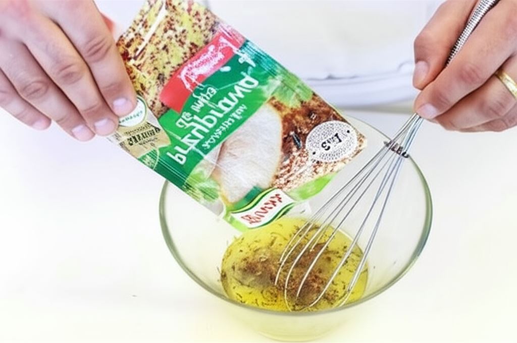 W naczyniu wymieszaj białe wino z oliwą, musztardą, przeciśniętym przez praskę czosnkiem, posiekanym tymiankiem i przyprawą Knorr.