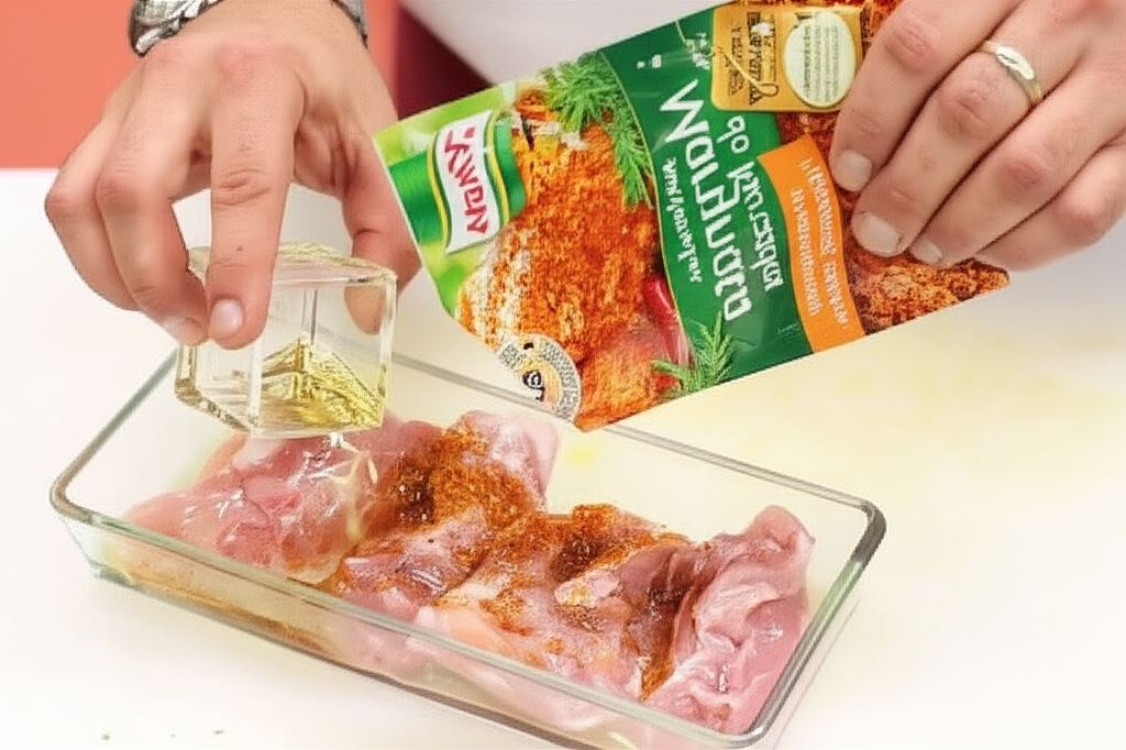 Mięso pokrop olejem i obsyp przyprawą Knorr. Odłóż mięso na minimum 30 minut, aby się zamarynowało.