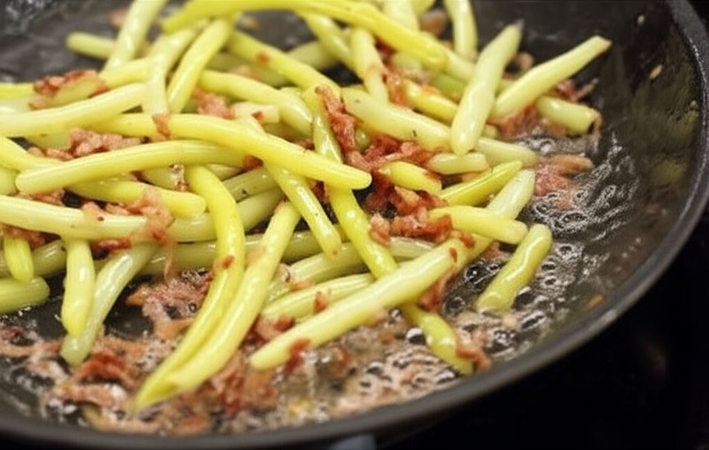 Boczek potnij w paski i zrumień na oliwie. Potem dodaj fasolkę i razem podsmaż. Upieczone mięso przenieś na talerz. Serwuj ze smażoną fasolką i, przykładowo, z ziemniakami.