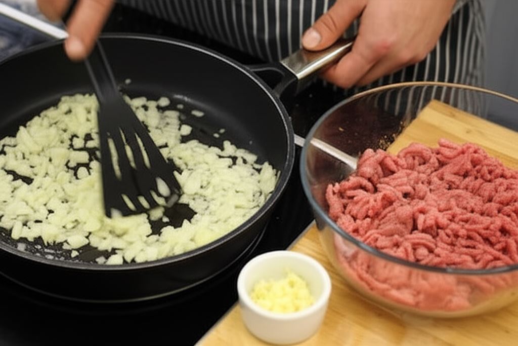 Obierz cebulę i czosnek, po czym drobno je posiekaj. Rozgrzej olej na patelni, wrzuć warzywa i zaczekaj aż się delikatnie zarumienią. Potem dodaj mielone mięso indycze i starannie wymieszaj wszystkie składniki. Smaż na średnim ogniu mieszając od czasu do czasu.