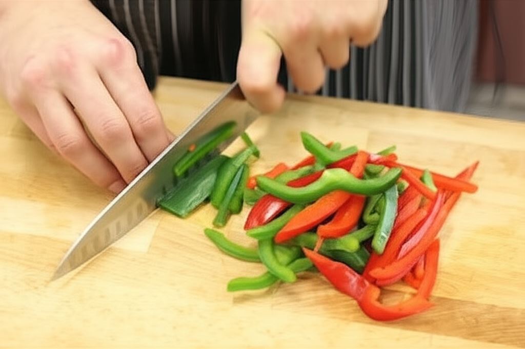W międzyczasie papryki opłucz, wysusz i pokrój w cienkie paski lub kosteczkę. Dodaj warzywa do mięsa, wlej ½ szklanki wody i duś pod przykryciem aż do momentu, kiedy papryka zmięknie, a mięso pięknie się zarumieni.