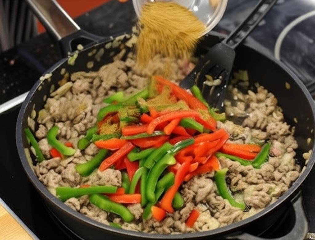 Dodaj do składników na patelni meksykańską mieszankę przypraw Adobo Knorr, sól i pieprz, po czym starannie wymieszaj całość.