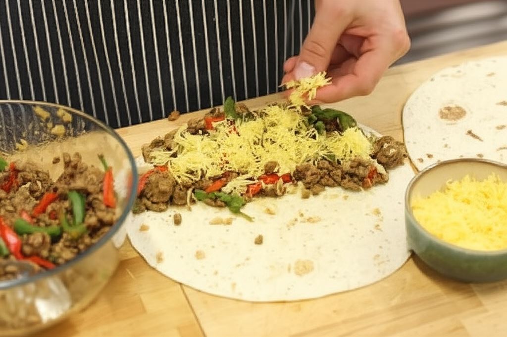 Przygotowany farsz wyłóż na placki tortilli i posyp startym serem – ilość wedle uznania.
