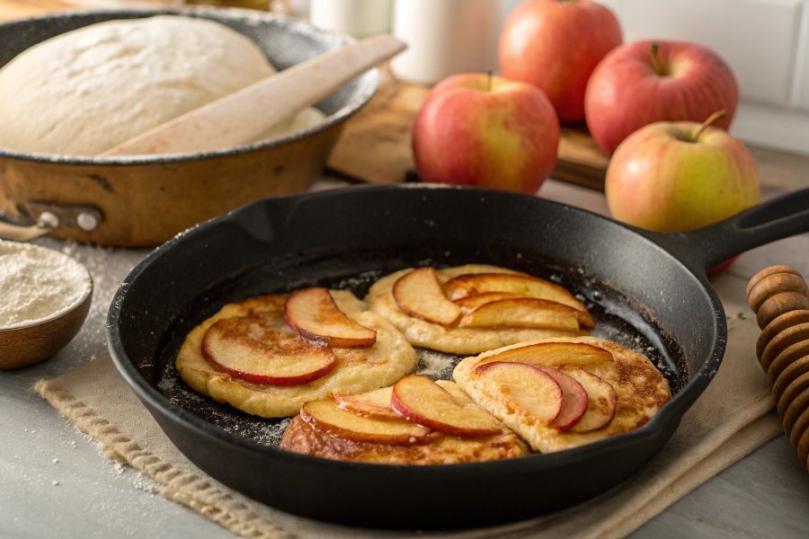 - Metoda nakładania – łyżką nakłada się porcję ciasta na patelnię, a następnie układa plasterki jabłek na wierzchu